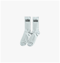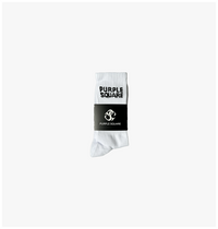 White sport socks. One size. PURPLE SQUARE stacked on the sides.